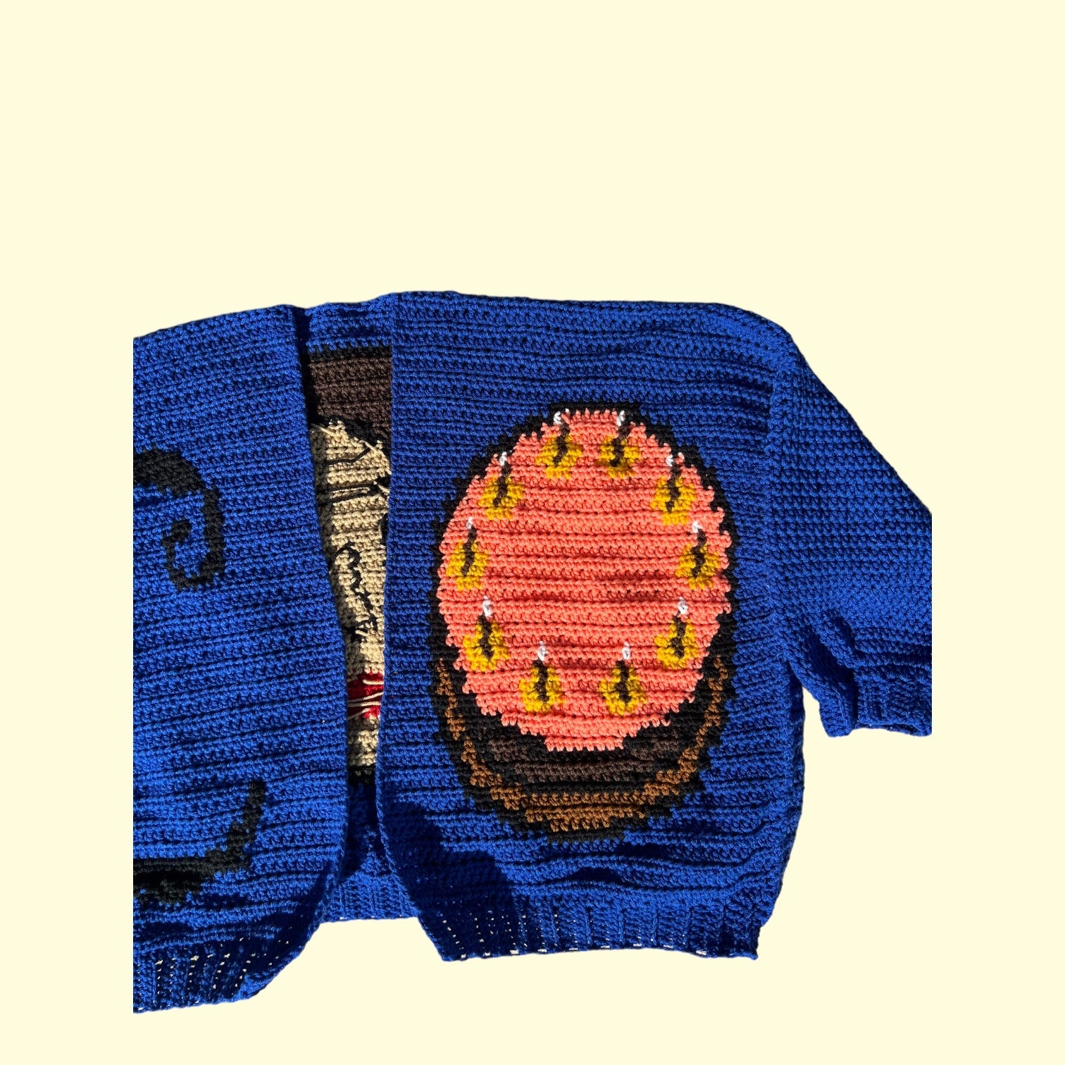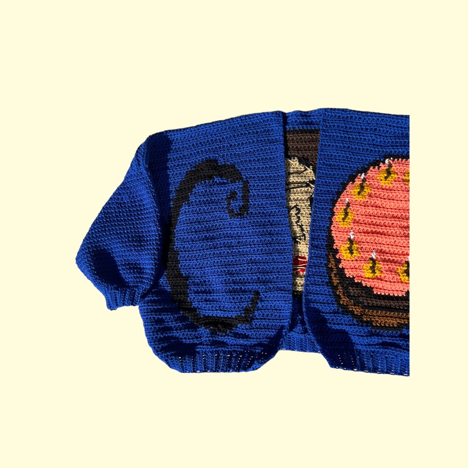100 % acrylic yarn, machine washable, dry on gentle cycle. I do recommend handwashing for smaller stains; the less it goes through the washing machine the more wear you’ll get on your garment!