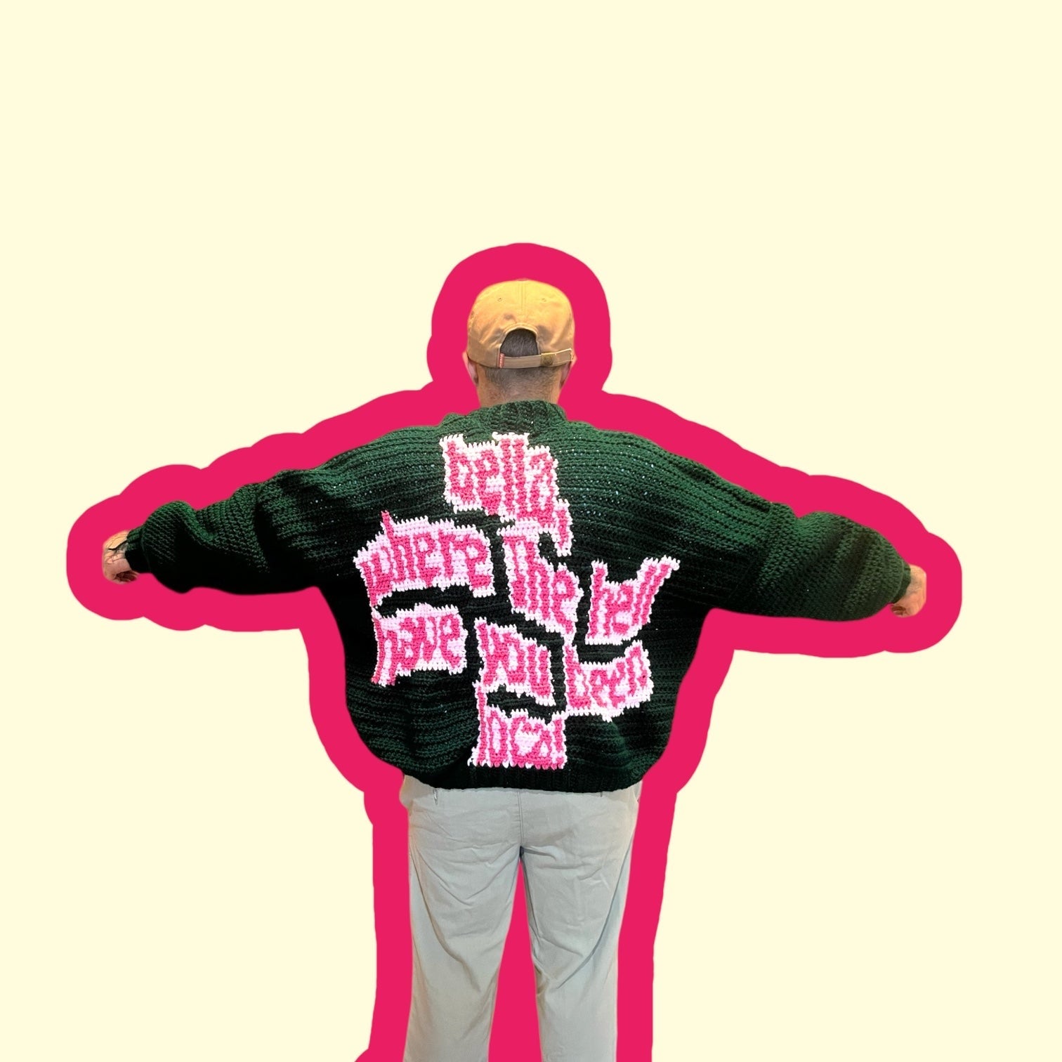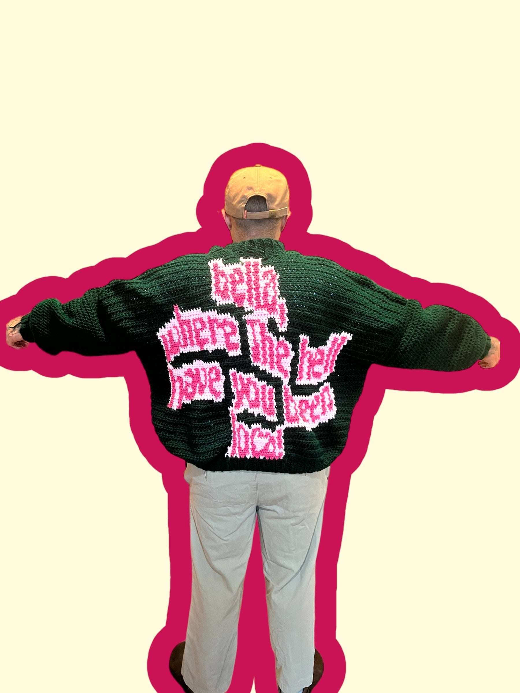 100 % acrylic yarn, machine washable, dry on gentle cycle. I do recommend handwashing for smaller stains; the less it goes through the washing machine the more wear you’ll get on your garment!